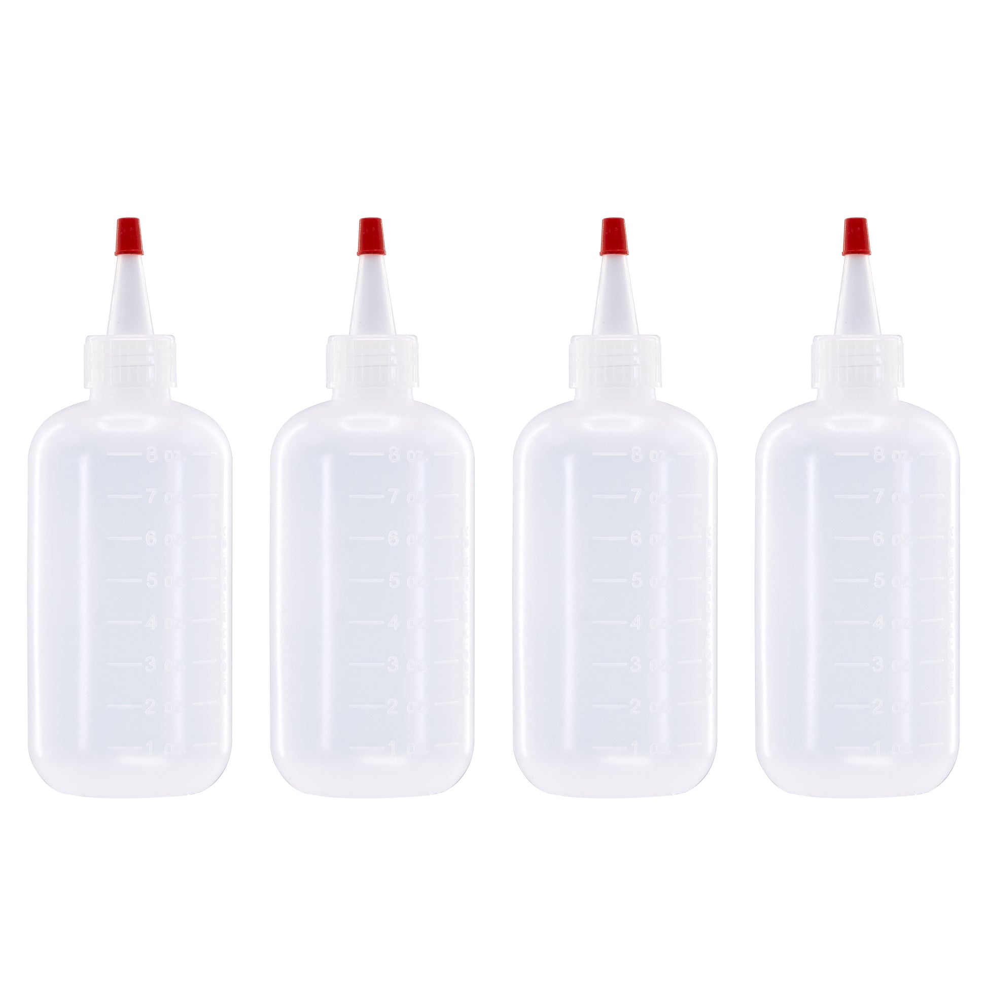 8 oz (240 mL) Plastic Boston Round Bottles with Yorker Spout Dispensing Caps You Get 4 - 8 oz Yorker Bottles with Red Cap ... They measure 1 oz thru 8 oz so its easy to use the correct amount if needed . They are very strong and durable ..Great for many kind of oils, liquids , solvents ... Yorker Type Bottles are made of LDPE Plastic and the top has a small hole for dispensing and include a red tip cap to cover the hole.. They are around 3 inches inches wide and measure over 6 inches at the top of the neck .... I have many listings of various types of bottles both Glass and Plastic...