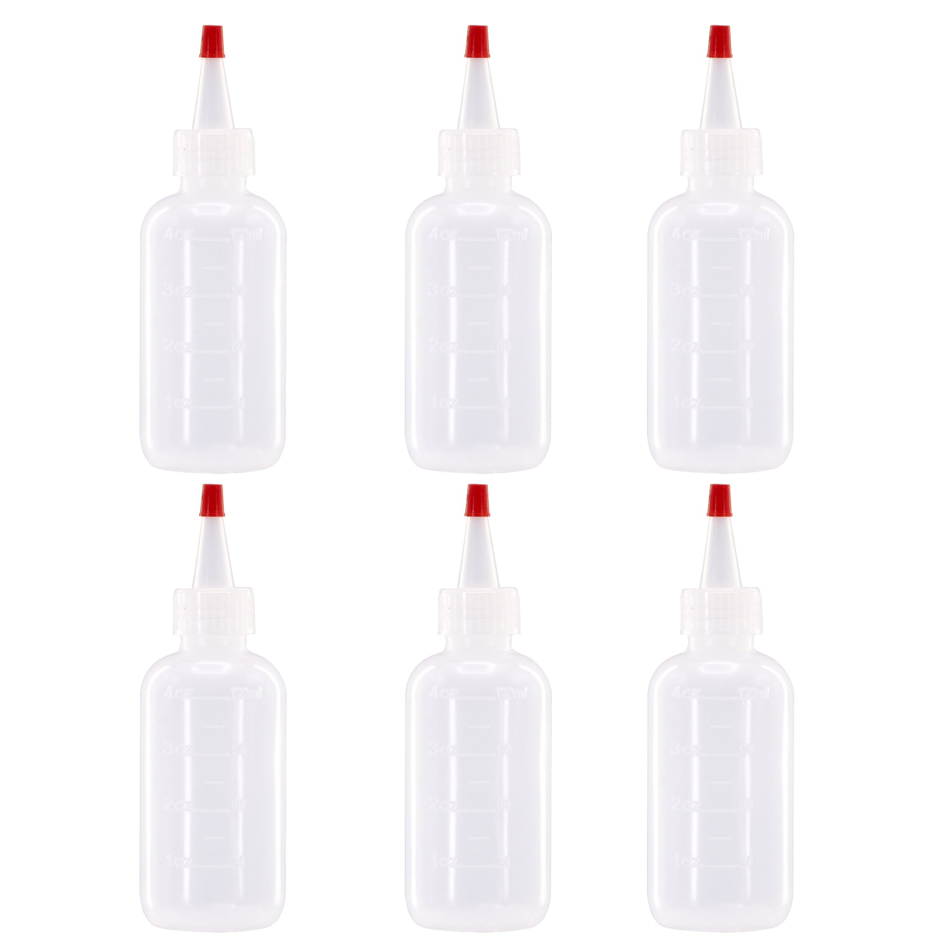 4 oz (120 mL) Clear Plastic Squeeze Bottles with Yorker Spout Dispensing Caps. You will get a Pack of 6 - 4 oz Clear Plastic Bottles with Red Cap ... They are very strong and durable ..Great for many kinds of oils, liquids, solvents ... Clear Plastic Squeeze Type Bottles are made of HDPE Plastic and the top has a small hole for dispensing and include a red tip cap to cover the hole.. They are around 3 inches wide and measure over 6 inches at the top of the neck ....